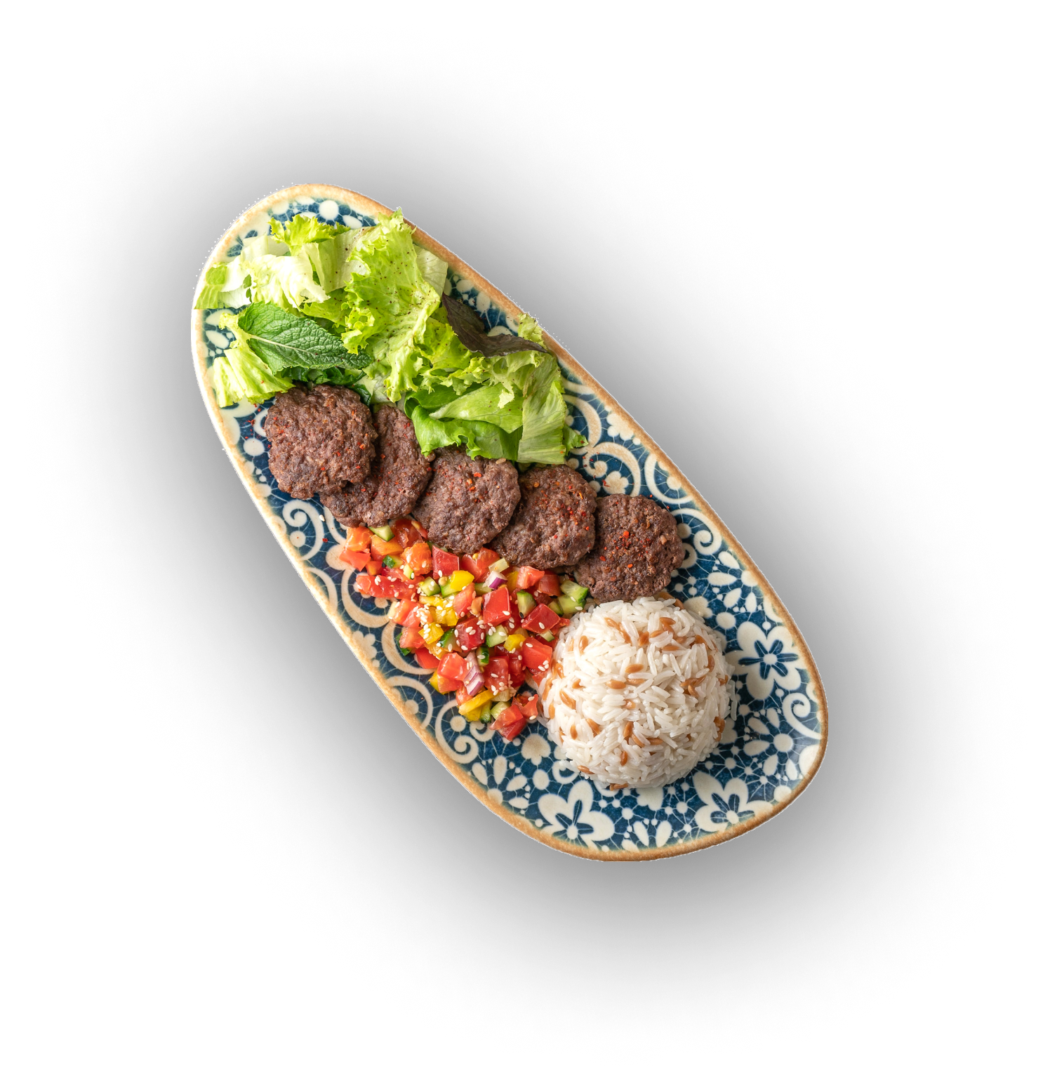Обжаренные на гриле пикантные котлетки из говядины, овощной салат с гранатовой заправкой и рисом по-турецки