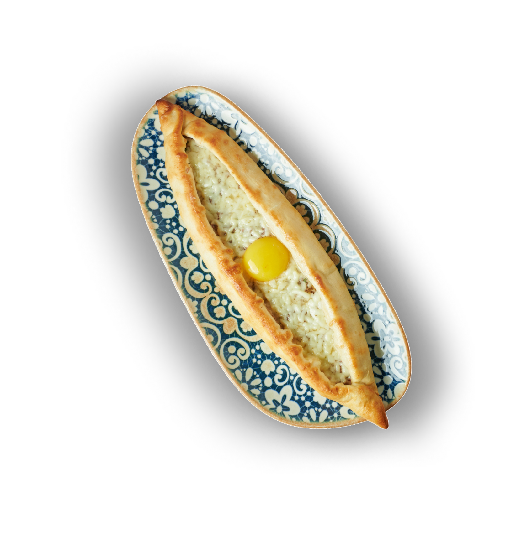 Лодочка из дрожжевого теста с сочной начинкой из говяжьего фарша с овощами и зеленью, покрытой сыром Сулугуни и яйцом