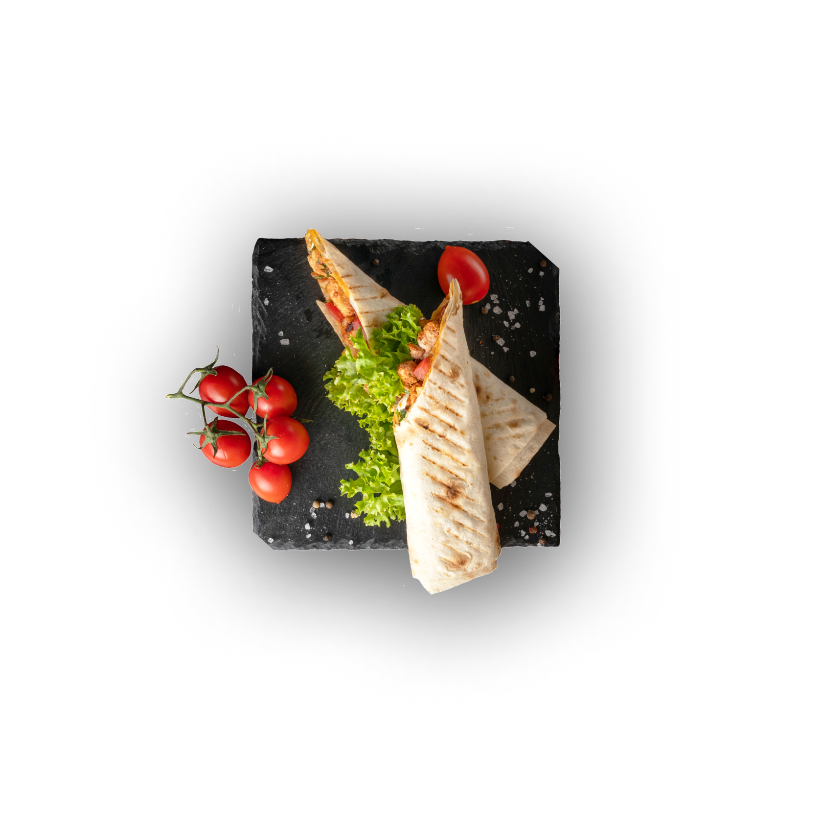 Сочное куриное филе в маринаде, обжаренное на гриле, свежие томаты, огурцы, зелень, соус и картофель фри в тонком лаваше или домашней лепешке с кунжутом