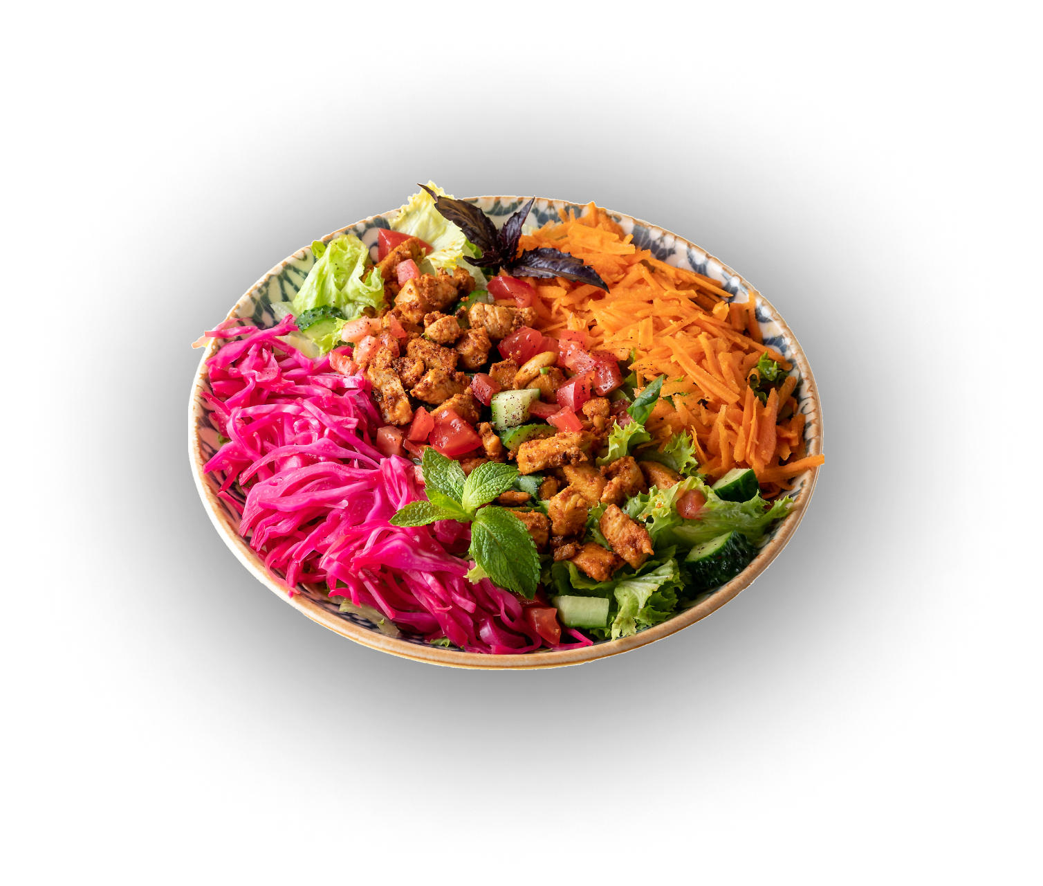Ломтики обжаренной на гриле куриной грудки и микс свежих листьев салата, шпината, черри и свежих огурцов, заправленный фирменным соусом на основе мацони