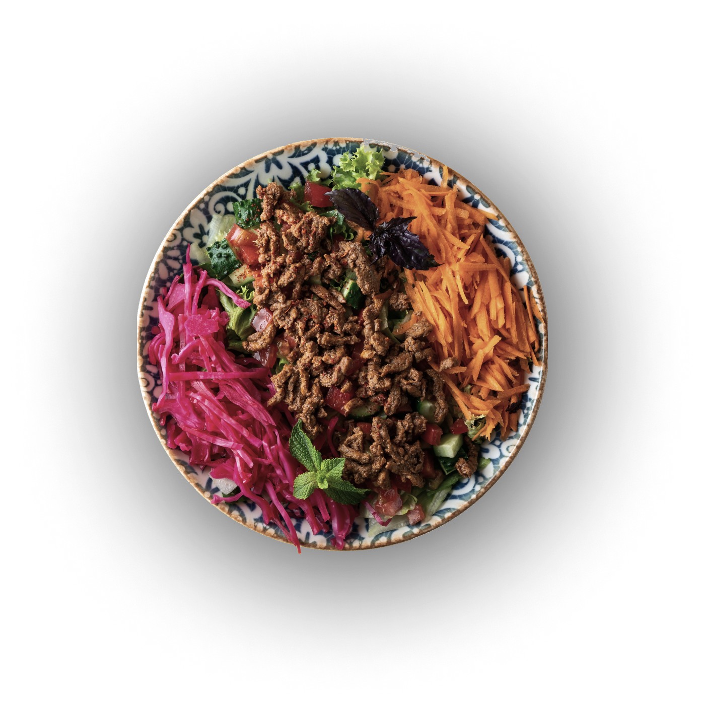 Ломтики томленой говядины и баранины и микс свежих листьев салата, шпината, черри и свежих огурцов, заправленный фирменным соусом на основе мацони